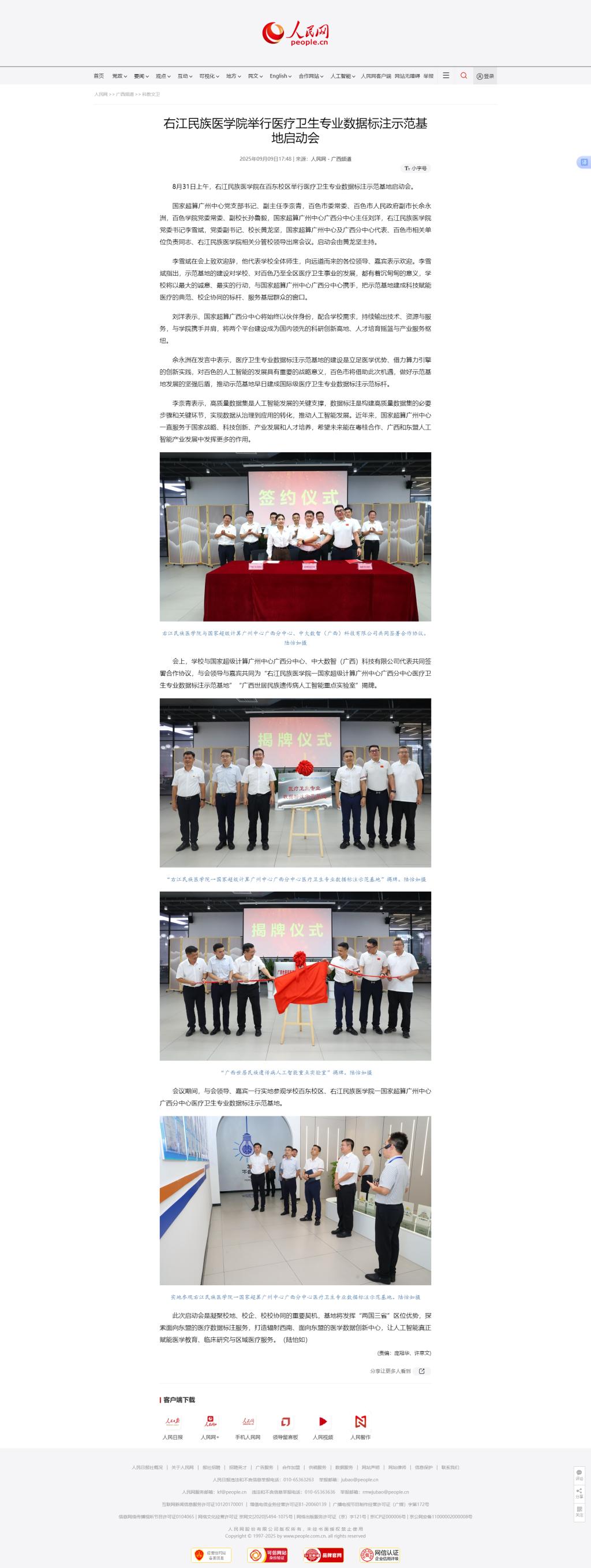 9月9日,人民网以《YABO鸭脖官网举行医疗卫生专业数据标注示范基地启动会》为题,报道了学校与国家超级计算广州中心广西分中心、中大数智(广西)科技有限公司代表共同签署合作协议,共同为“YABO鸭脖官网——国家超级计算广州中心广西分中心医疗卫生专业数据标注示范基地”揭牌。