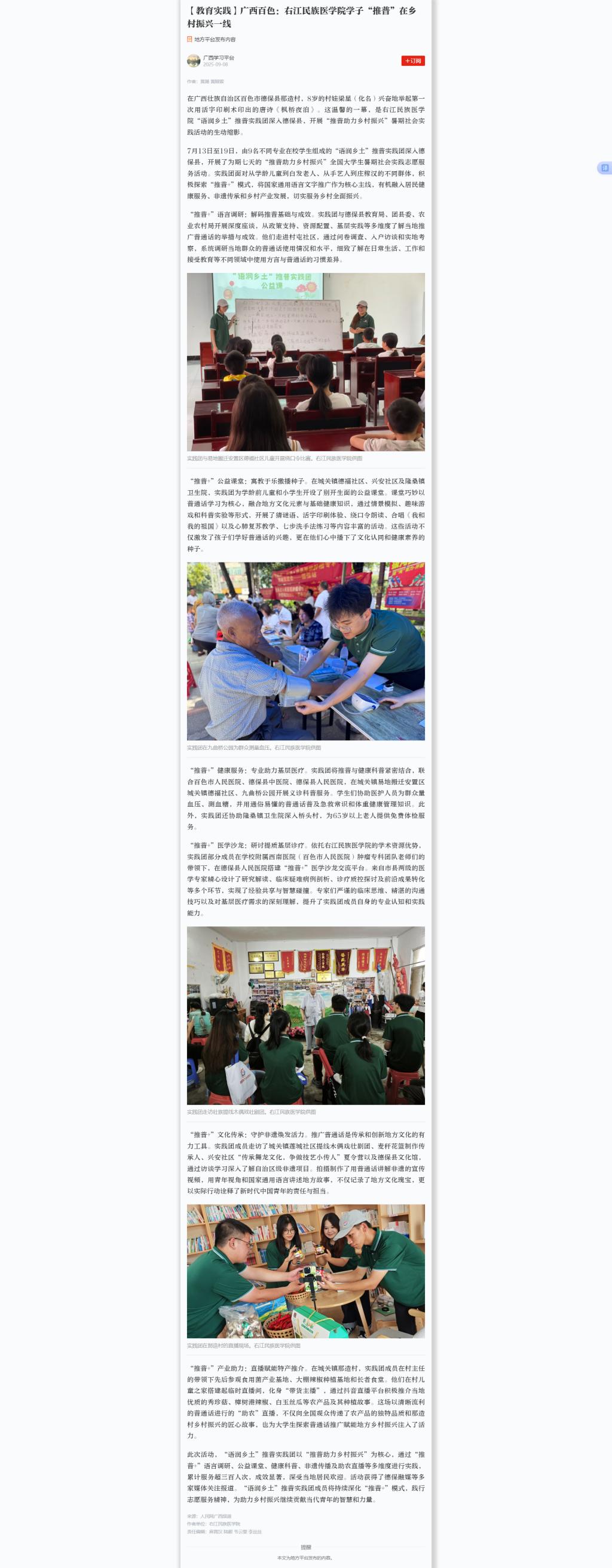 9月8日,学习强国以《YABO鸭脖官网学子“推普”在乡村振兴一线》为题,报道了YABO鸭脖官网“语润乡土”推普实践团深入德保县开展“推普助力乡村振兴”暑期社会实践活动。