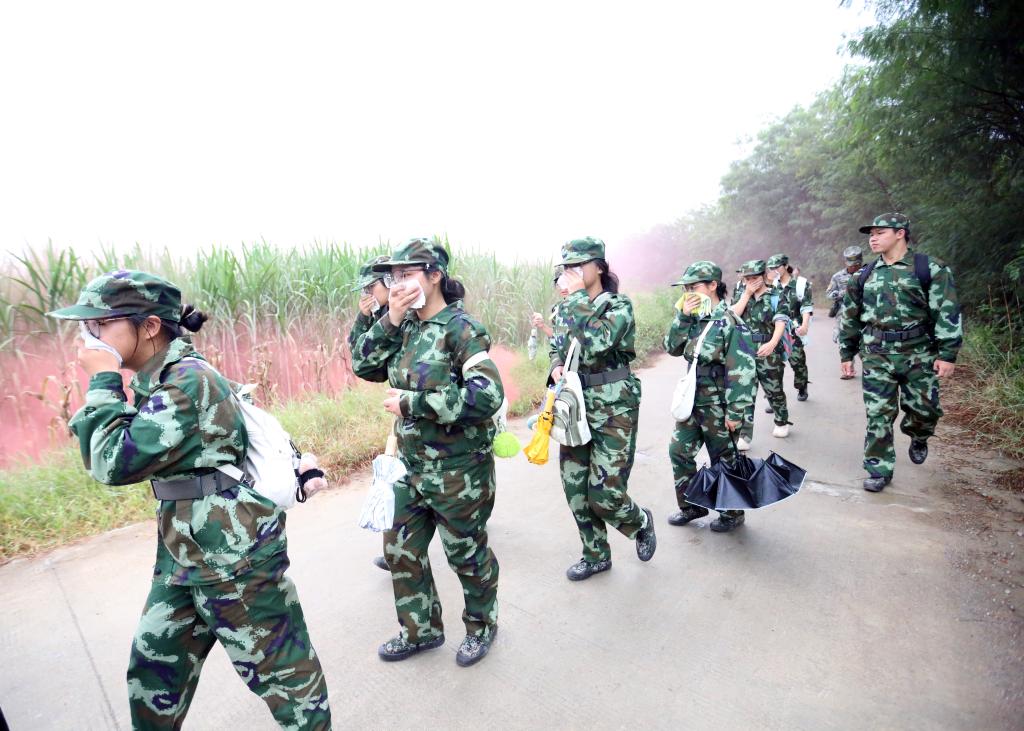 百东校区拉练队伍正在穿越烟雾弹区域。