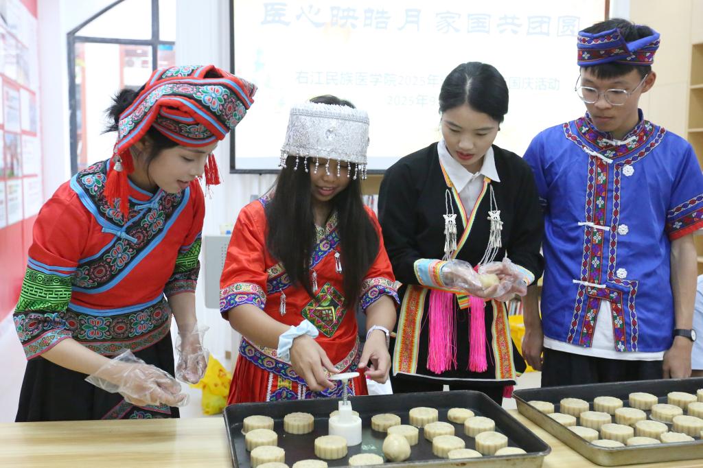 下午三时,食堂工作人员精心准备了豆蓉、莲蓉等月饼制作馅料,70余名师生代表在后勤面点师傅的指导下一步步操作,一小时内制作出300余枚印有“大医精诚”校训的月饼,提前点燃中秋佳节氛围。23健管本班韦钰湘分享道:“第一次亲手做月饼,仿佛把对学校和家人的祝福也一并揉进了馅料、烤进了金黄的外皮里。整个过程既新奇又温暖,让这次中秋月饼制作活动变得格外有趣、难忘。”