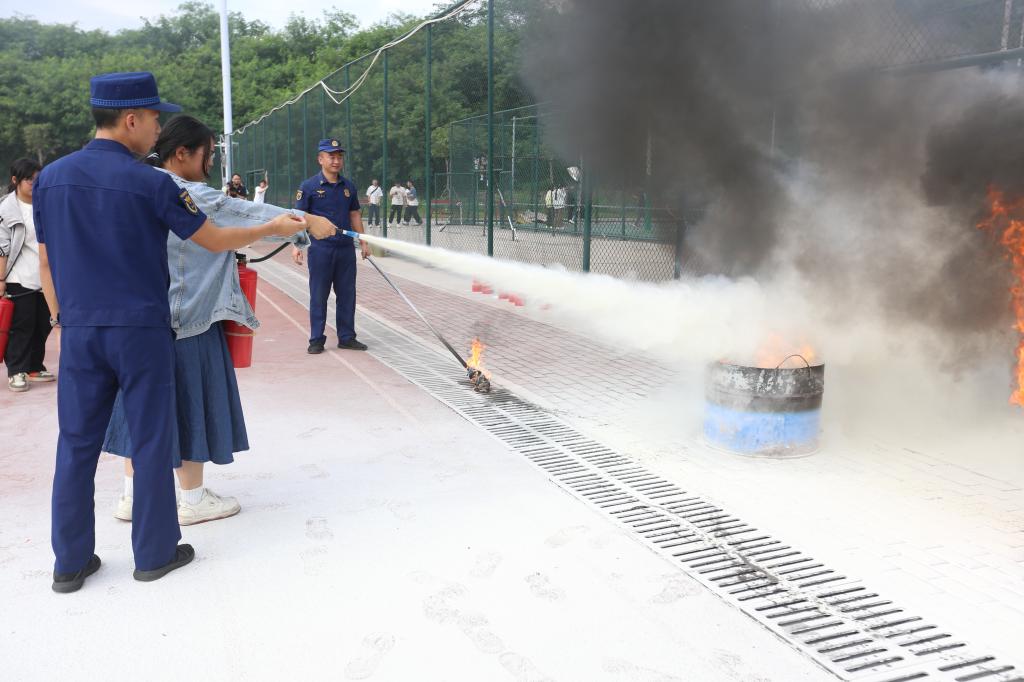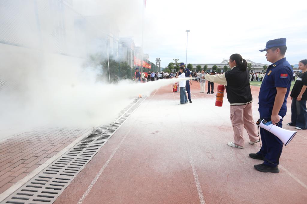疏散完成后,消防救援大队教官现场讲解消防安全知识,结合典型火灾案例,剖析校园火灾隐患,强调日常用电、用火等安全注意事项。在灭火器实操环节,教官示范“提、拔、握、压”标准动作后,反复强调“对准火焰根部喷射”的关键技巧。随后,师生代表依次上前体验,亲手操作灭火器扑灭模拟火点,从“看理论”到“练实操”,直观掌握灭火技能,现场响起阵阵掌声。