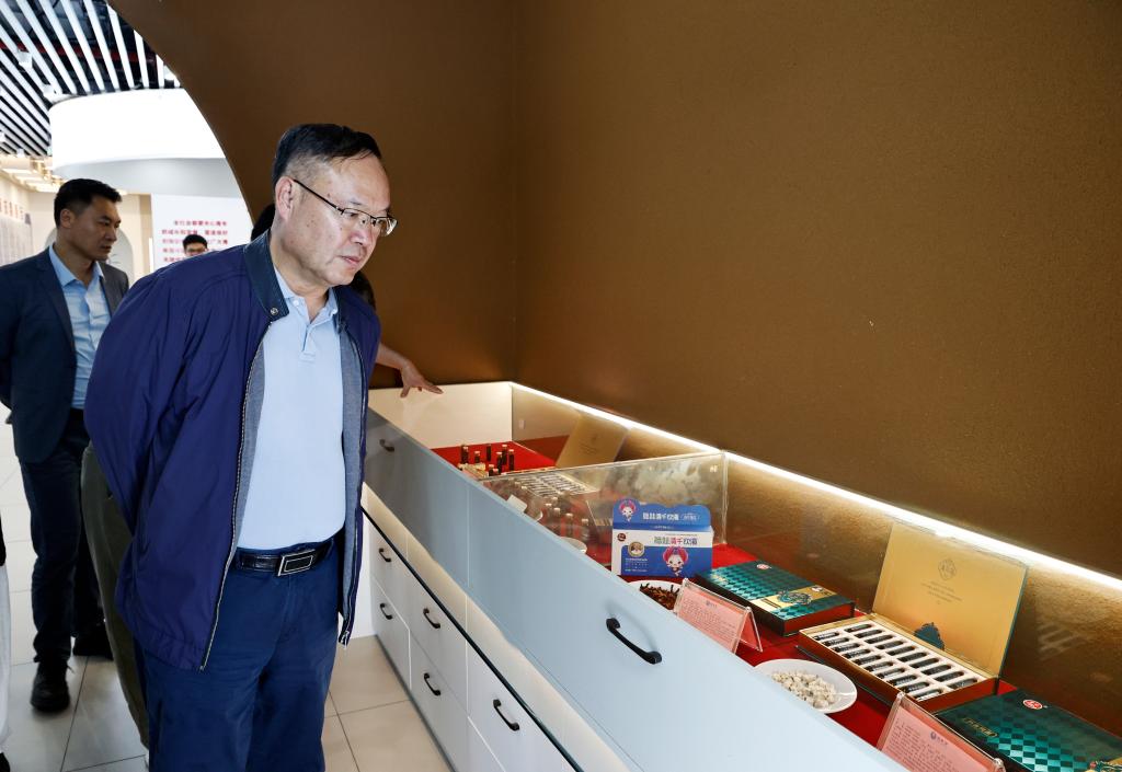 曹坤华一行在东盟创新创业中心查看鸭脖部分成果转化情况。