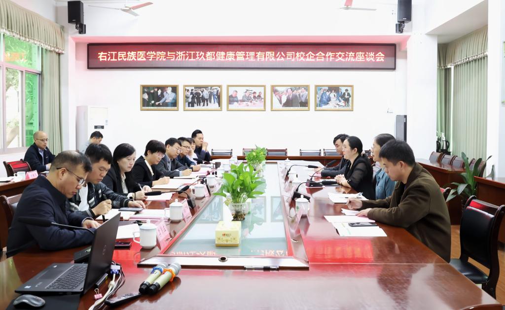 11月5日,浙江玖都健康管理有限公司景小红董事长一行5人到鸭脖访问交流,双方在图书馆二楼会议室召开座谈交流会。学校党委副书记赵丽娟,党委常委、副校长王俊利出席会议,发展规划处、教务处、科技处、团委、招生与就业指导中心及各二级学院负责人参与会议。会议由王俊利主持。