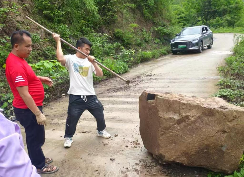 张家庆组织党员群众清理道路落石。