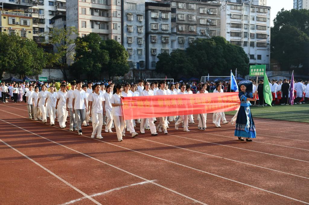 伴随着激昂的《运动员进行曲》,入场式率先拉开帷幕。国旗队迈着整齐划一、铿锵有力的步伐步入运动场,鲜艳的五星红旗在阳光的照耀下熠熠生辉,彰显着庄重与威严。紧随其后的是裁判员方块队、各二级学院方块队以及机关代表方块队。他们口中喊着嘹亮的口号,展现出朝气蓬勃的少年风采,赢得了全场阵阵热烈的掌声。这跃动的身影与鲜亮的色彩,不仅是校园活力的直观体现,更让每一位在场的右医人深刻锚定“同属一个集体”的身份联结,增强了集体荣誉感。