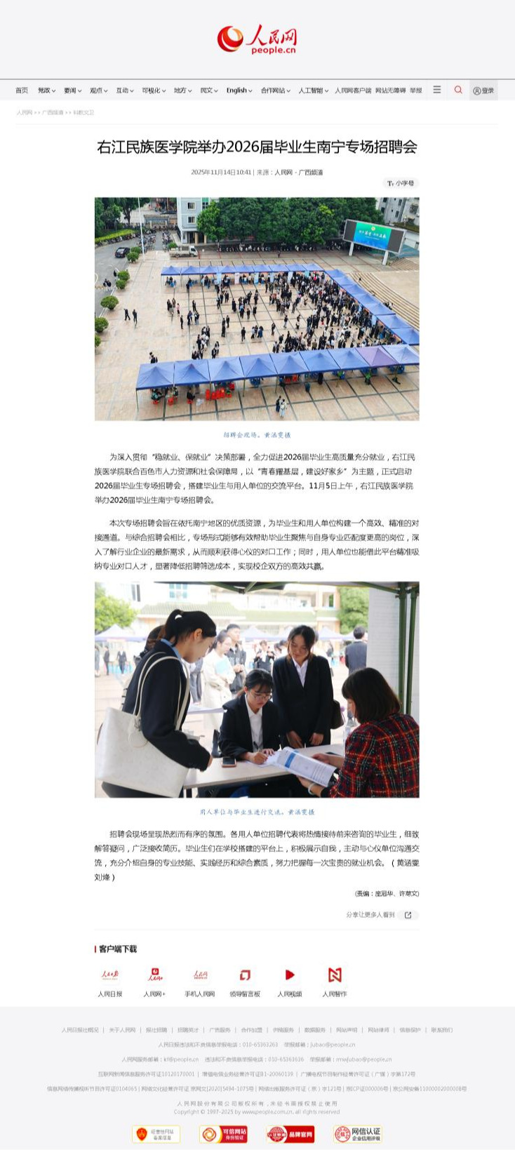 11月14日,人民网以《YABO鸭脖官网举办2026届毕业生南宁专场招聘会》为题,报道了鸭脖积极搭建毕业生与用人单位的交流平台,促进2026届毕业生高质量就业。