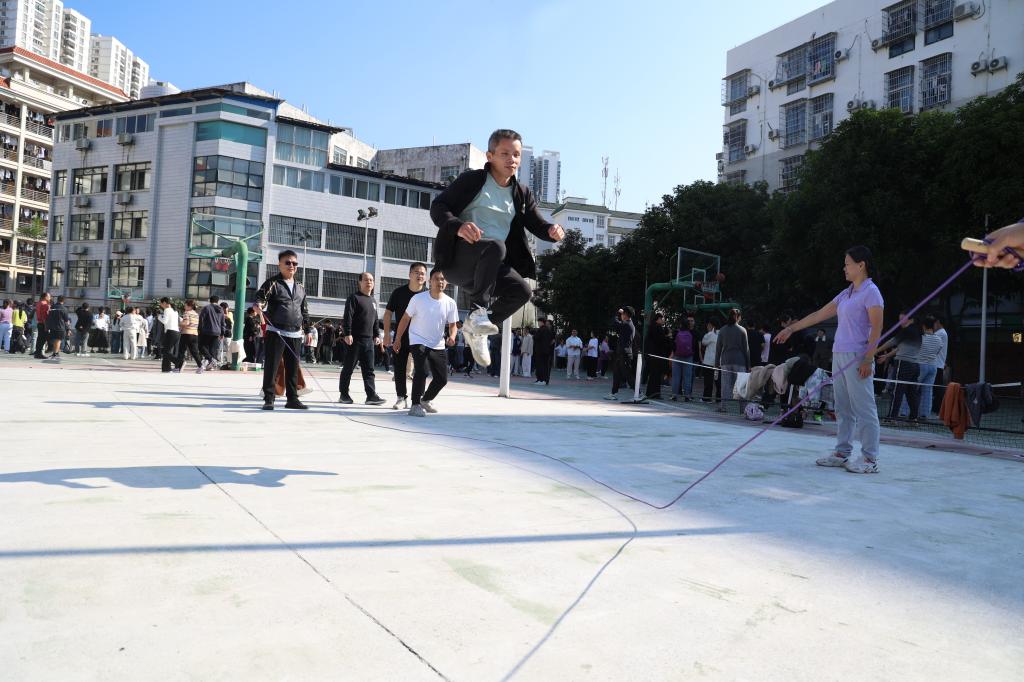 田径场旁边的篮球场上,跳绳比赛率先进行,选手们或单人跳、或双人交替跳,彩色跳绳在空中划出优美弧线。运动员们节奏平稳、耐力十足,凭借灵活身法快速跳跃通过绳索,即便中途失误也迅速调整状态重新起跳。右医附院病理科一队的韦国辉表示:“教职工比赛不仅可以拉近师生间的距离,团体类比赛还增强了老师与老师、团队与团队之间的凝聚力。”