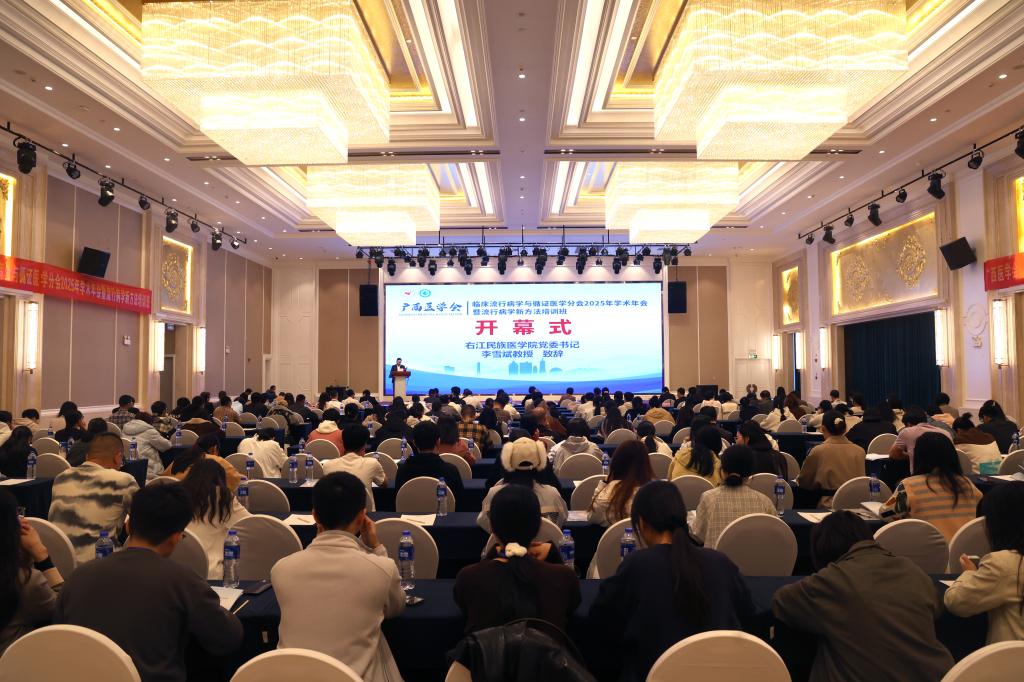 11月14日至16日,广西医学会临床流行病学与循证医学2025年学术年会暨流行病学方法培训班在百色顺利召开,来自全区各高校、医院及医疗卫生系统的200余名专家学者、医护人员齐聚一堂,围绕学科前沿动态、实践应用成果等核心议题展开深入交流,共同推动我区临床流行病学与循证医学领域的高质量发展。本次年会由广西医学会主办,广西医学会临床流行病学与循证医学分会承办,鸭脖附属医院(临床医学院)和公共卫生学院、广西医科大学公共卫生学院、桂林医科大学公共卫生学院共同协办。开幕式由鸭脖党委常委、副校长谭盛葵主持。