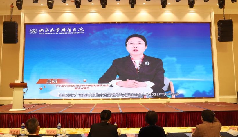 中华医学会临床流行病学和循证医学分会副主任委员、山东大学附属齐鲁医院吕明教授通过线上致辞。吕明从全国学科发展视角出发,分享了临床流行病学与循证医学的最新研究进展和前沿发展趋势,对广西在该领域取得的成绩给予高度评价。吕明希望大家要加强与国内外顶尖团队的交流合作,不断提升学科影响力,为全国临床流行病学与循证医学发展贡献“广西智慧”。