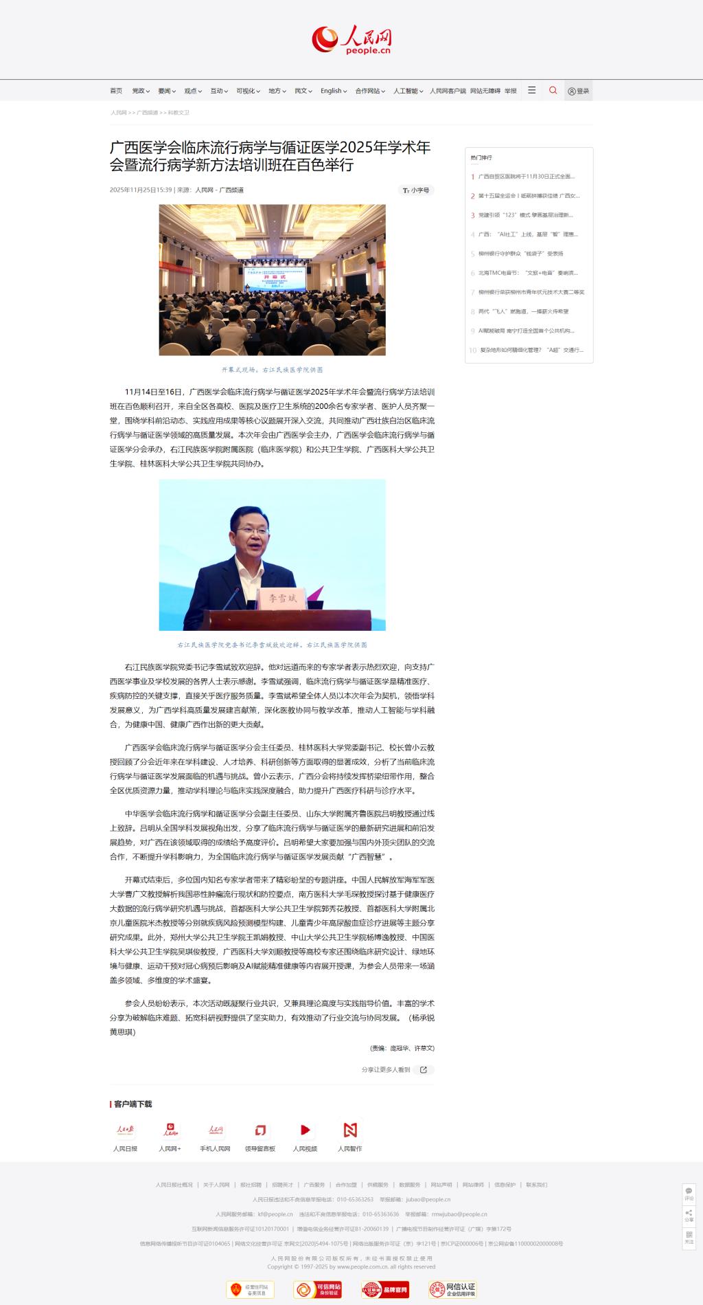近日,人民网报道鸭脖党委书记李雪斌出席在百色举行的广西医学会临床流行病学与循证医学2025年学术年会暨流行病学新方法培训班。李雪斌在开幕式上致欢迎词,希望全体人员以本次年会为契机,领悟学科发展意义,为广西学科高质量发展建言献策,深化医教协同与教学改革,推动人工智能与学科融合,为健康中国、健康广西作出新的更大贡献。