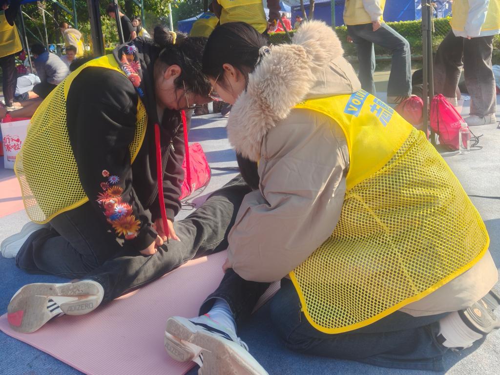 清晨5时30分,天还未亮,210名志愿者已陆续抵达各自服务点位。在组委会工作人员的统筹指导下,大家迅速完成场地布置、物资清点、设备调试等赛前准备工作,以饱满状态迎接赛事开启。随着参赛选手陆续途经各点位,志愿者们即刻进入高效服务模式,在长达四小时的服务周期内,有序开展线路引导、用水补给、健康观察、应急处置等志愿服务。面对数千名参赛选手的密集需求,他们始终保持耐心细致,从为选手递上电解质饮料时的温馨提醒,到发现选手不适时的快速响应,每一个细微之处都彰显着右医志愿者的用心与热忱。