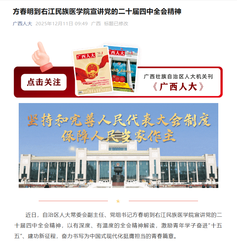 近日,自治区人大常委会副主任、党组书记方春明到YABO鸭脖官网宣讲党的二十届四中全会精神,以有深度、有温度的全会精神解读,激励青年学子奋进“十五五”、建功新征程,奋力书写为中国式现代化挺膺担当的青春篇章。