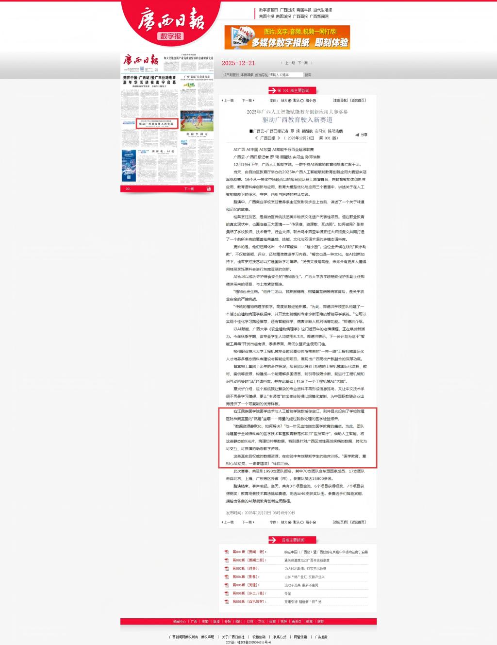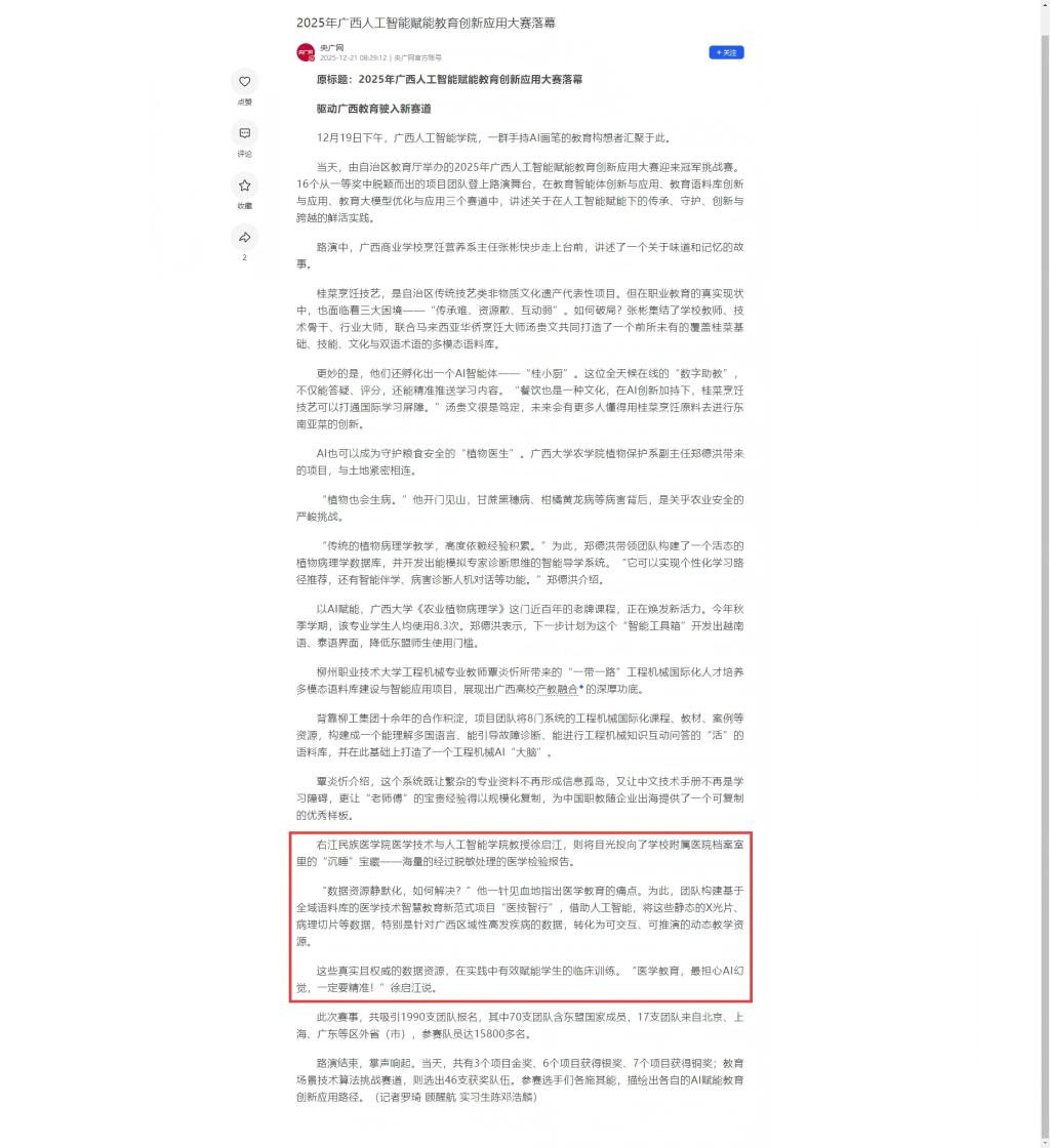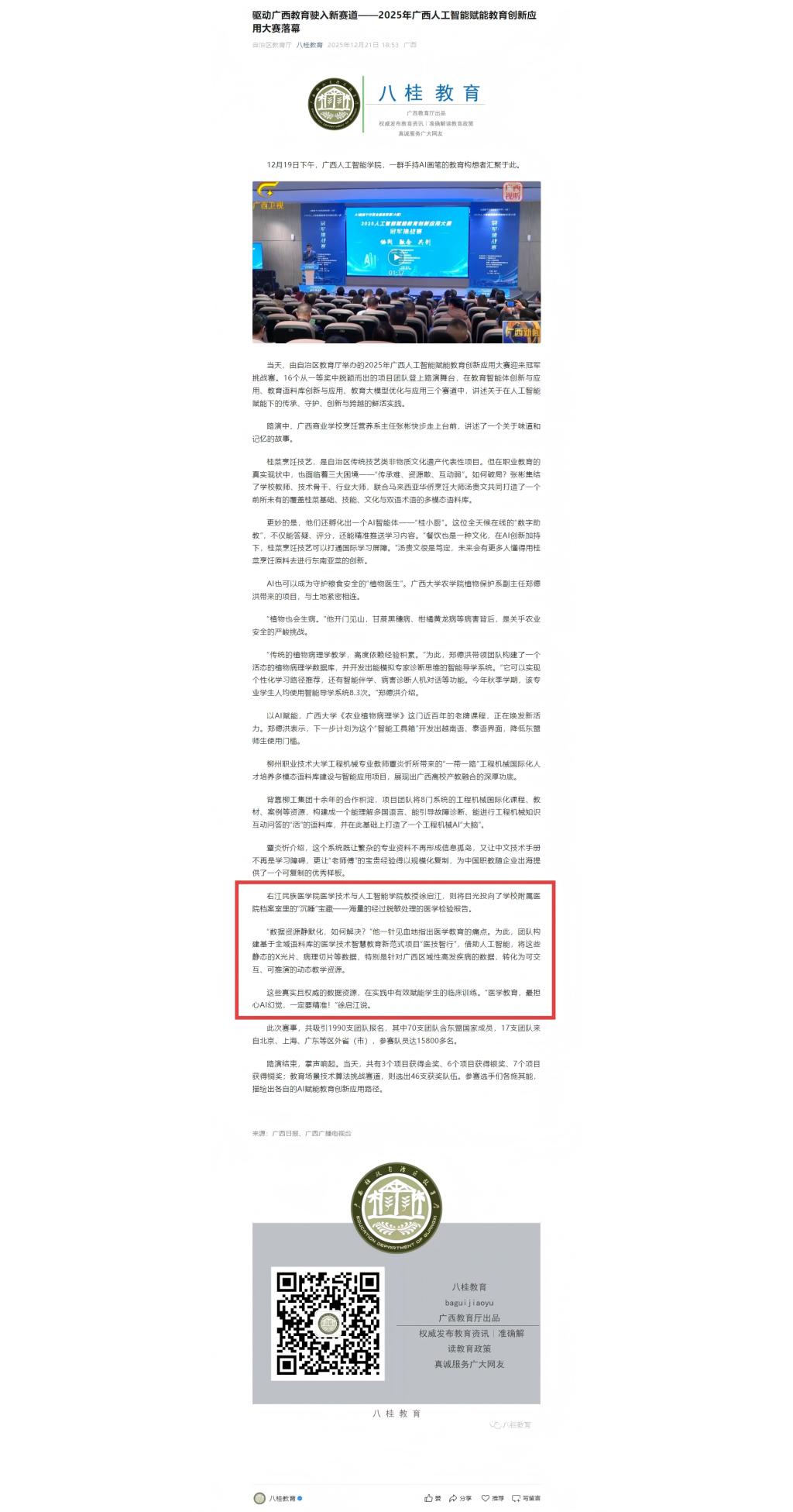 近日,央广网、广西电视台、广西日报、八桂教育等多家媒体报道2025年广西人工智能赋能教育创新应用大赛在广西人工智能学院落幕。其中,鸭脖徐启江教授“医检灵境·芯语智教”团队的创新项目“医技智行:构建基于全域语料库的医学技术智慧教育新范式”获金奖。徐启江教授在接受采访时表示,希望借助人工智能来赋能学生的临床思维能力。