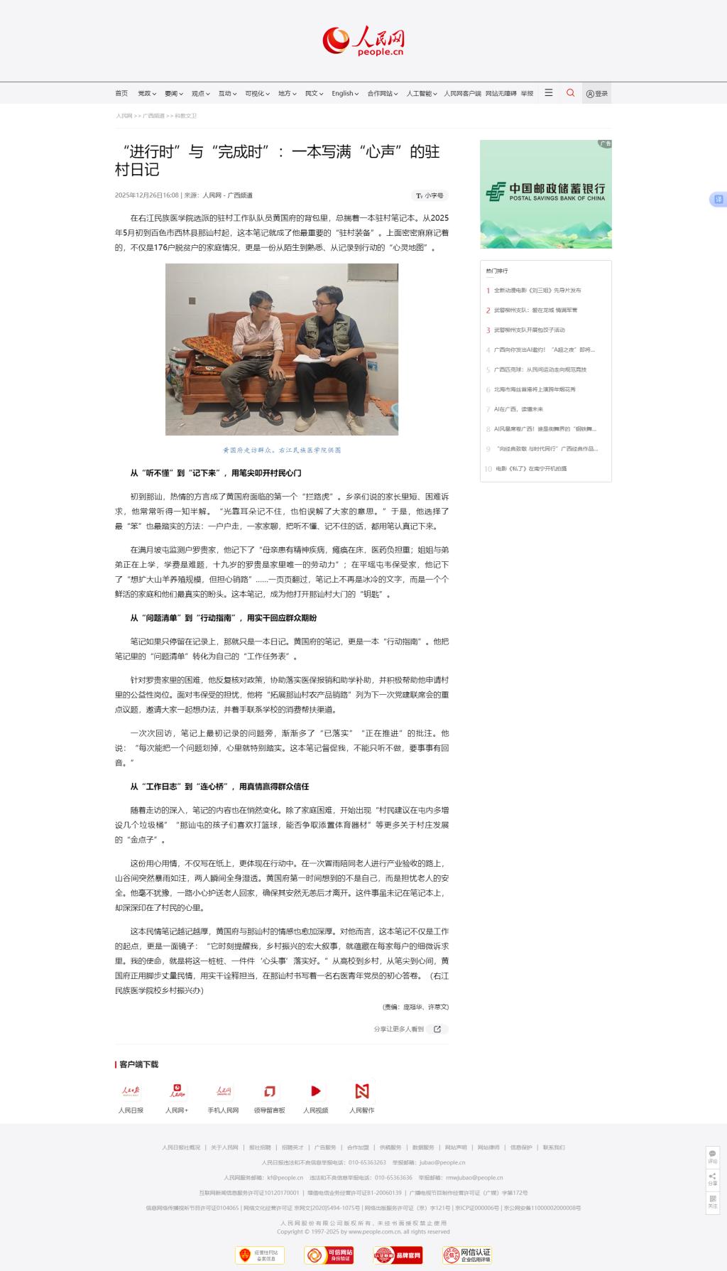 12月26日,人民网以《“进行时”与“完成时”:一本写满“心声”的驻村日记》为题,报道了YABO鸭脖官网驻村工作队队员黄国府,从2025年5月初到百色市西林县那讪村驻村起,通过一本写满“心声”的驻村笔记,解群众之难,聚发展之力,用实干诠释担当,书写一名右医青年党员的初心答卷。