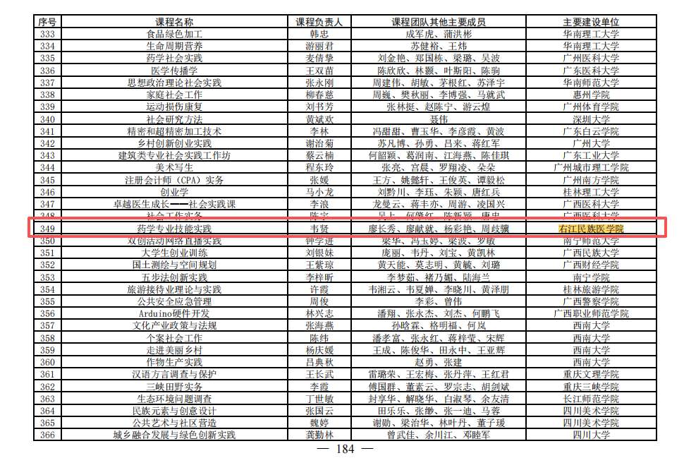 近日,教育部公布第三批国家级一流本科课程认定结果,鸭脖药学院韦贤教授负责的《药学专业技能实践》成功获批社会实践一流课程,实现药学院国家级一流课程“零的突破”。