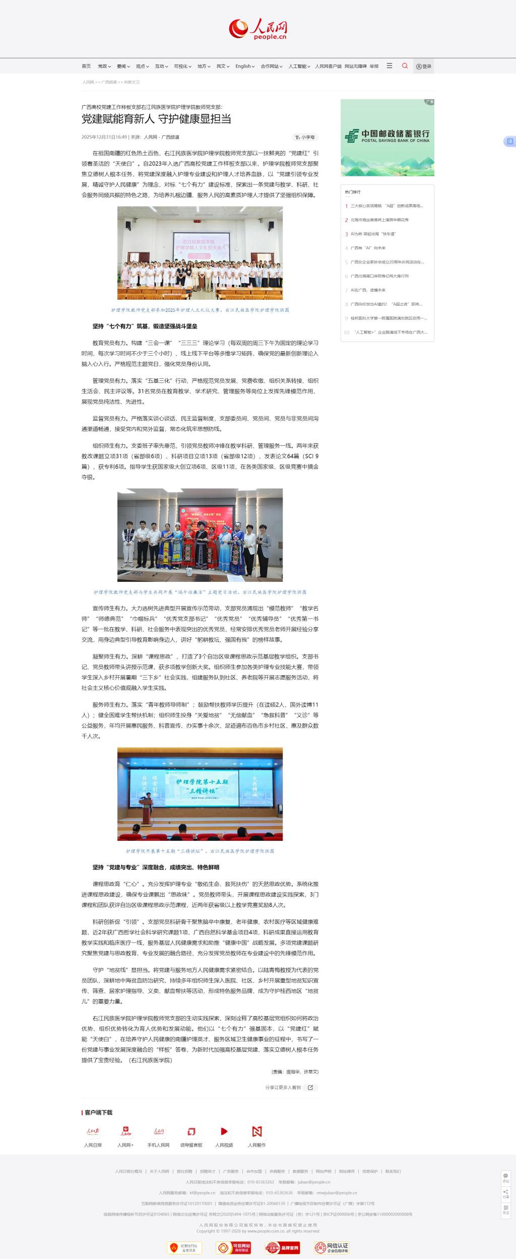 12月31日,人民网以《党建赋能育新人 守护健康显担当》为题,报道YABO鸭脖官网护理学院教师党支部自2023年入选广西高校党建工作样板支部以来,聚焦立德树人根本任务,将党建深度融入护理专业建设和护理人才培养血脉,以“党建引领专业发展,精诚守护人民健康”为理念,对标“七个有力”建设标准,探索出一条党建与教学、科研、社会服务同频共振的特色之路,为培养扎根边疆、服务人民的高素质护理人才提供了坚强组织保障。