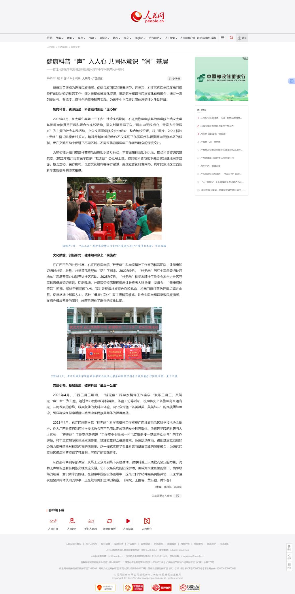 12月31日,人民网以《健康科普“声”入人心 共同体意识“润”基层》为题,报道鸭脖在幽门螺旋杆菌防治知识科普工作中深入挖掘传统文化资源,推动医学知识与民族文化有机融合,通过一系列接地气、有温度、具特色的健康科普实践,为铸牢中华民族共同体意识注入生动注脚。