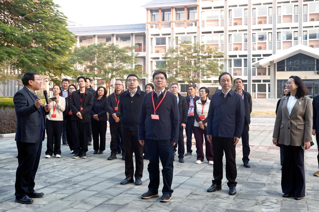 调研组在百色市人大常委会主任、党组书记周武红,百色市委常委、市人民政府副市长余永洲,鸭脖党委常委、副校长周艳娥及党委常委、副校长王俊利等人陪同下,深入校园一线,通过听取汇报、实地察看、现场交流等方式,全面深入了解学校发展现状与未来规划。
