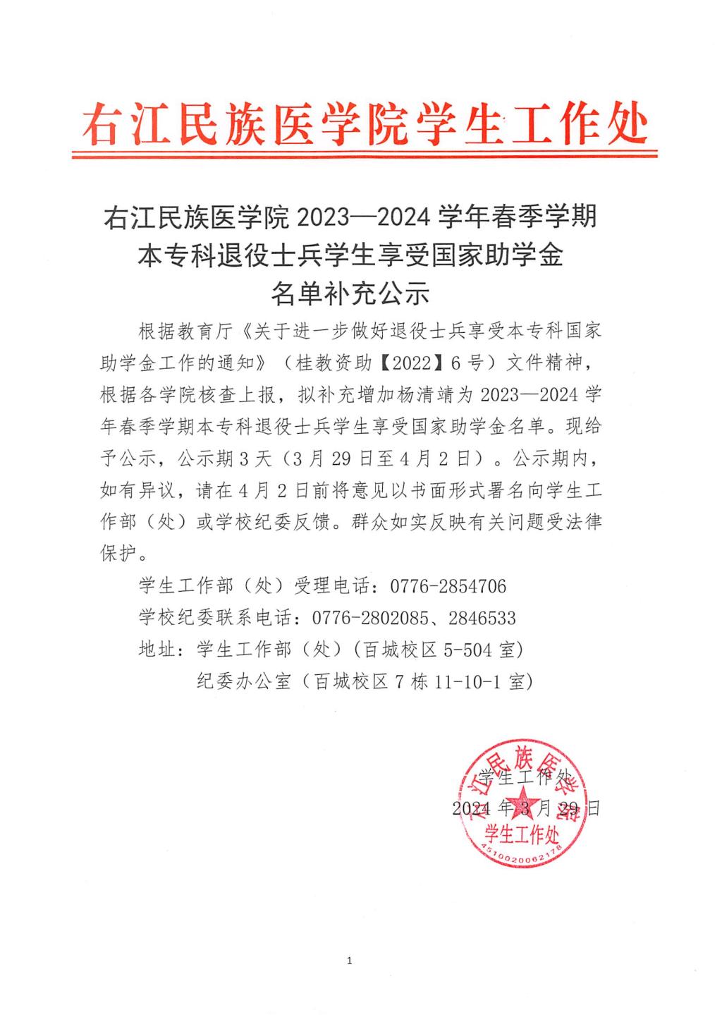 YABO鸭脖官网2023—2024学年春季学期本专科退役士兵学生享受国家助学金名单补充公示.pdf