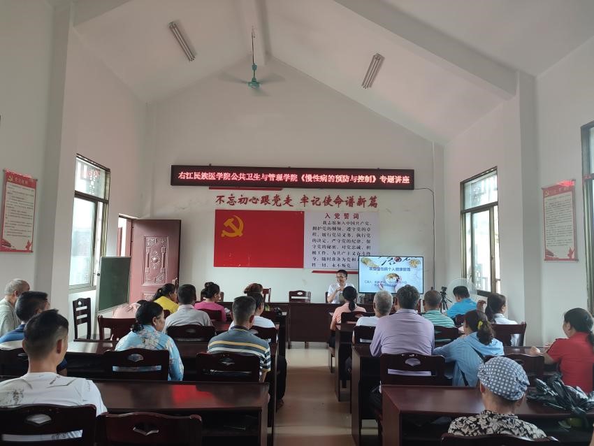 为让科学研究真正服务于社会大众并产生正面、积极的效果,推进和增加全民健康、慢性病防治等科普活动的次数和成效,6月29日下午,该学院在那务村举办“慢性病的预防与控制”专题讲座,由健康服务与管理教研室梁旭老师主讲,他通过运用通俗易懂的语言向当地村民科普高血压、糖尿病等常见慢性病知识,并介绍如何预防和控制慢性病的发生。