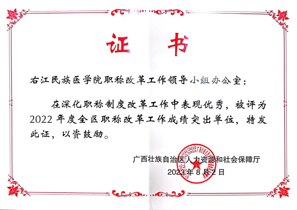 近日,根据《广西壮族自治区人力资源和社会保障厅关于表扬2022年度全区职称改革工作成绩突出单位和个人的通知》(桂人社函〔2023〕151号)文件,鸭脖被授予“2022年度全区职称改革工作成绩突出单位”荣誉称号。