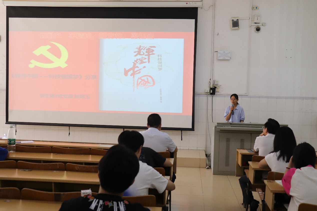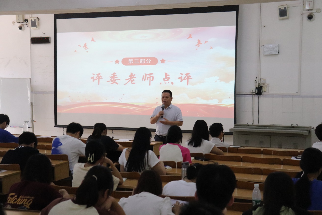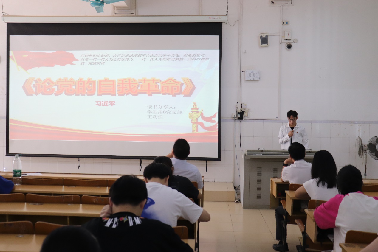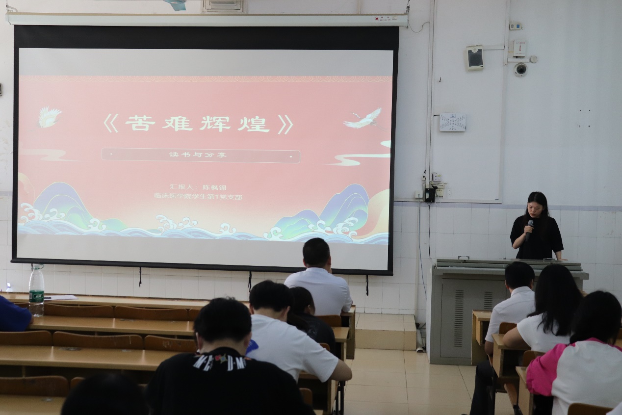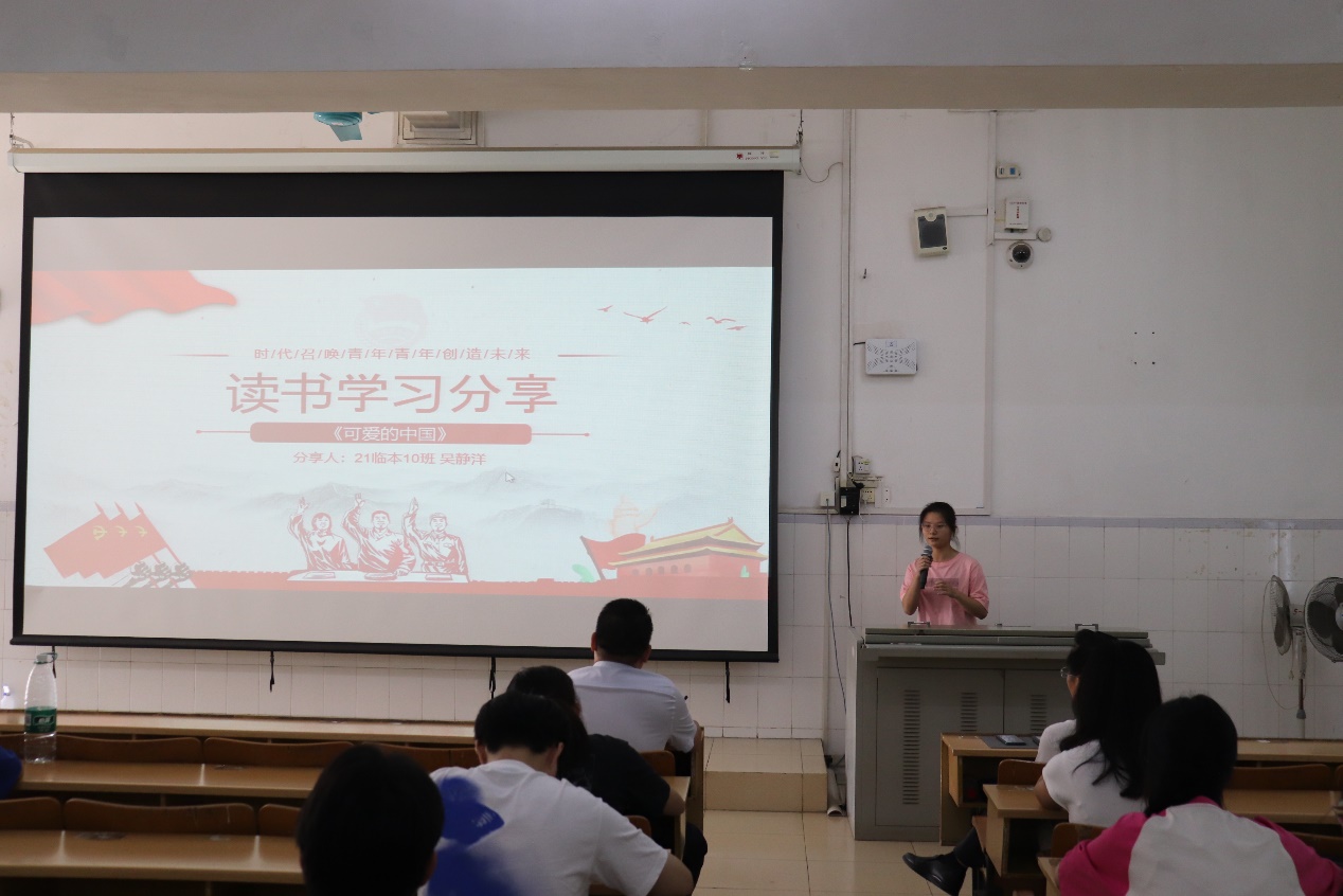 为庆祝中华人民共和国成立74周年,深入学习和理解党的思想理论,弘扬爱国主义精神和革命传统,营造热爱祖国的集体气氛,丰富同学们的校园生活,培养学生党员的实践能力,促进学生党员之间的学习交流,2023年9月26日,临床医学院学生党支部在5栋401开展以“迎国庆、学精神、强党性、勇担当”为主题的读书分享会活动。来自9个学生党支部的9名选手,分别围绕对所选图书的阅读心得体会,开展了精彩的PPT展示分享,临床医学院学生科科长肖刚老师、临床医学院团委书记覃富老师及各党支部党员、入党积极分子代表到场观摩比赛。