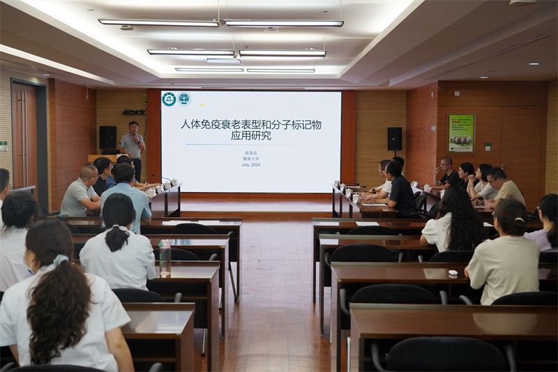 在学术交流会上,陈国兵教授应邀作了《人体免疫衰老表型和分子标记物应用研究》的专题讲座,分享了免疫细胞衰老方向的最新研究成果以及取得的科研硕果,为进一步推动老年主动健康奠定了坚实的数据和理论基础。讲座结束后,陈国兵教授与参会人员就报告内容、学科建设等方面进行了深入讨论交流,现场学术气氛活跃浓烈。