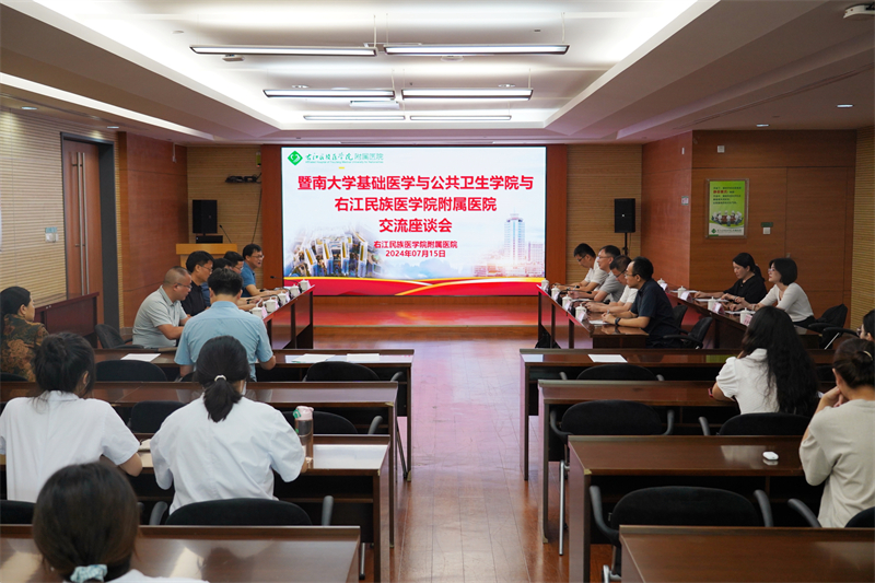 7月15日上午,暨南大学基础医学与公共卫生学院院长陈国兵教授一行8人来到右医附院开展学术交流活动,YABO鸭脖官网副校长谭盛葵出席座谈会并致欢迎词,右医附院党委书记黄照河、院长韦忠恒、副院长邓益斌,肿瘤科、神经内科、康复医学科医护人员及在读研究生等参加学术交流活动。右医附院院长韦忠恒主持交流座谈会。