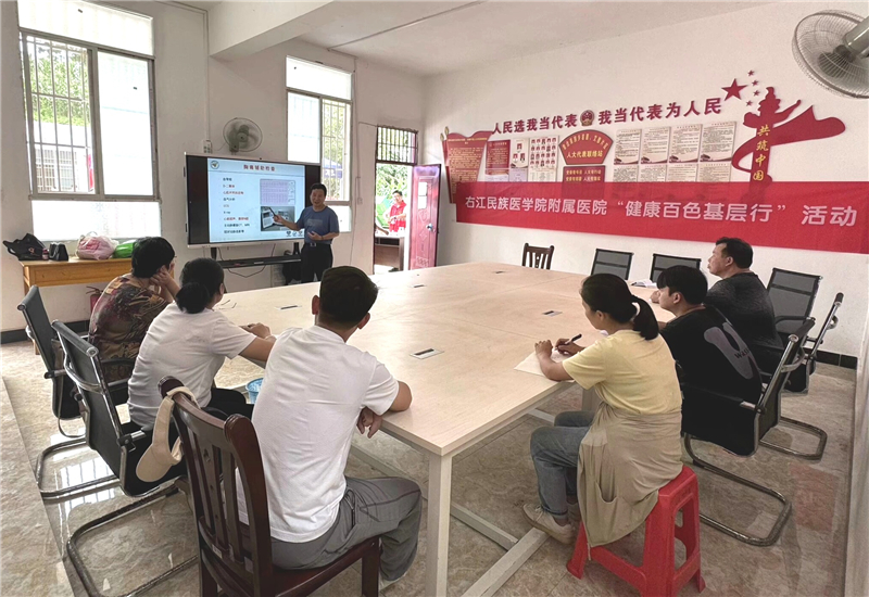 活动现场,全科医学科游金勇老师就“蛇咬伤后的正确急救措施”“小儿发热的合理用药”以及“卒中与胸痛症状的早期辨识与应对”等主题,为当地乡村医生进行了深入细致的专题培训,旨在提升他们的急救救治能力。同时,义诊专家们为每位村民提供了针对性的诊疗方案与建议,并免费发放了所需药品,细致讲解了药品的正确使用方法,耐心细致地回答了村民们关于健康问题的各类疑问。此外,实践团成员还积极为村民提供了血压监测、血糖检测以及健康宣教等多元化健康服务。活动获得了当地村民的一致好评。