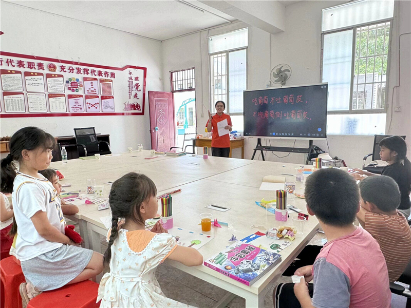 完成对火龙果基地的实地调研,实践团队一行返回活动中心,并在活动中心用心开展了富有教育意义的游戏活动及普通话宣教课堂活动。在游戏环节中,团队成员耐心引导小朋友们通过绘画表达内心的乐园愿景,并共同制作手工艺品,锻炼他们的动手及创作能力。在宣教课堂上,实践团成员积极鼓励小朋友们练习普通话发音,进一步加深了他们对普通话的认知与理解。活动尾声,实践团队还向岩腊村的孩子们赠送了书籍、笔记本等学习用品,以激发他们对知识的渴望与追求。