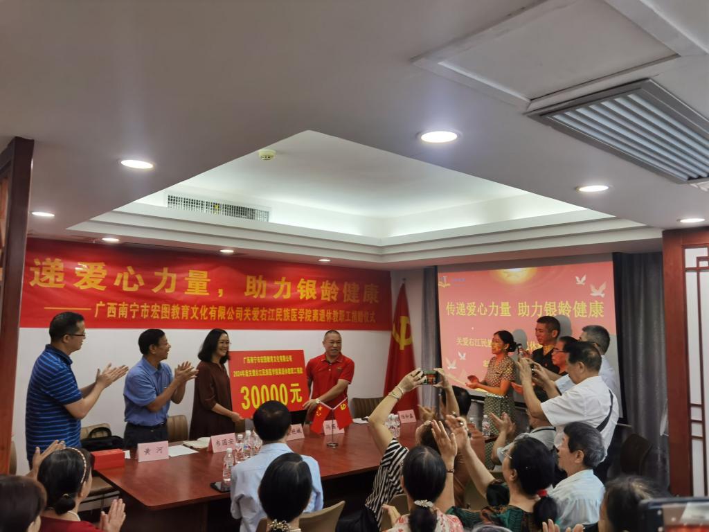 会上,周艳娥通报了学校重大工作及改革发展情况,并为老党员颁发“在党五十周年纪念章”;离退休党委领导汇报离退处现状及本年度工作;冯国东代表宏图公司向鸭脖离退休教职工捐赠3万元。据悉,该公司此前已两次向鸭脖贫困生和困难老同志捐款,激励贫困大学生努力学习,成才报国,为困难老同志雪中送炭,解除后顾之忧,还为鸭脖在南宁的离退休同志提供集体学习的活动场地和会务服务,以实际行动践行中华民族尊老爱幼的传统美德和企业担当。