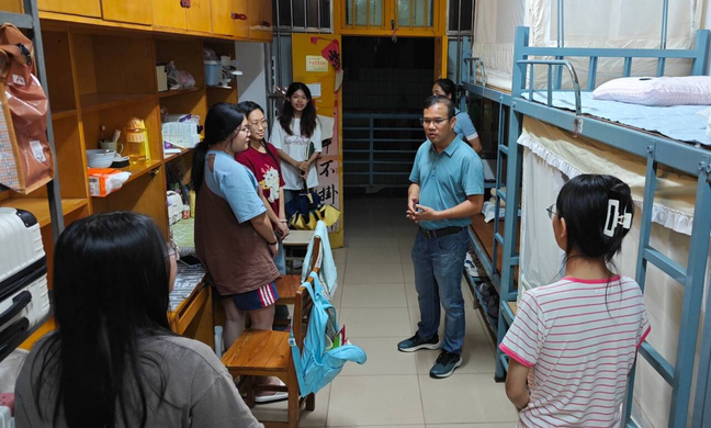 9月7日晚,人文与管理学院党委书记、院长李常应带领院长助理、学生科负责人韦艳春和2024级辅导员、各新生班班主任及班主任助理走访2024级新生宿舍。
