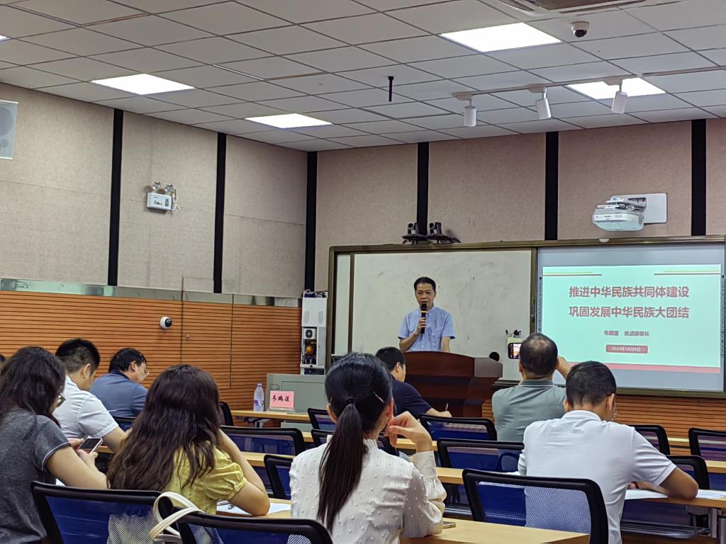 首先,韦部长带领大家原原本本学习了习近平总书记在全国民族团结进步表彰大会上的重要讲话,并指出这次全国民族团结进步表彰大会,是在以中国式现代化全面推进强国建设、民族复兴关键时期召开的一次重要会议,充分体现了以习近平同志为核心的党中央对民族团结进步事业的高度重视。习近平总书记的重要讲话,是推动中华民族共同体建设、巩固和发展中华民族大团结的纲领性文献,为我们在新时代新征程上做好党的民族工作、办好人民满意的教育指明了前进方向,提供了根本遵循。随后,韦部长还结合广西和学校实际,传达了自治区和学校党委关于铸牢中华民族共同体意识的工作要求,要求马克思主义学院发挥鸭脖民族团结进步创建先进集体的示范引领作用,在共建共享“五个家园”、铸牢中华民族共同体意识教育等工作中做出积极贡献。
