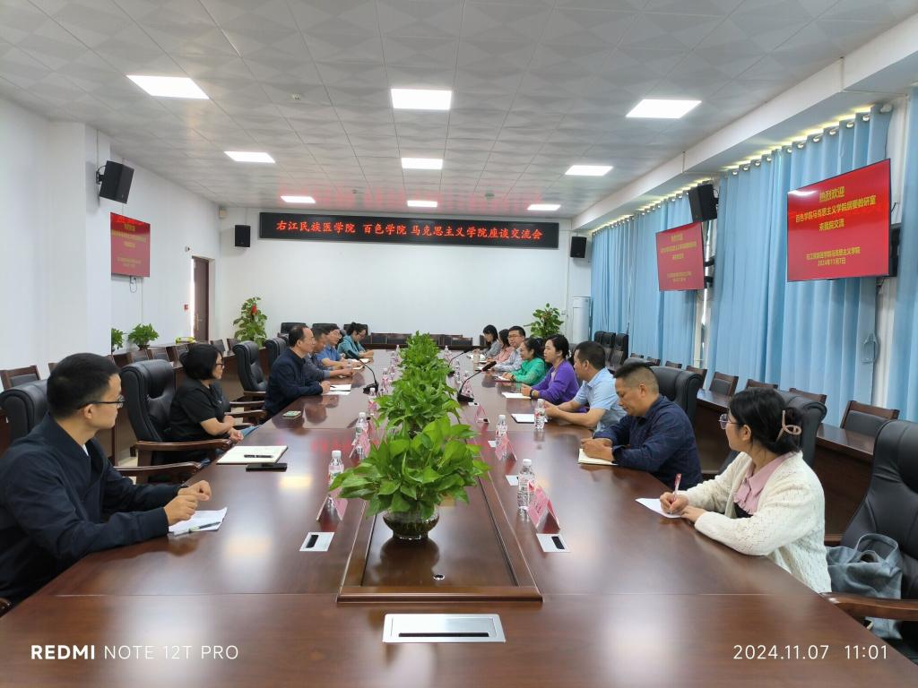 11月7日,百色学院马克思主义学院中国近现代史纲要教研室来我院交流,座谈会在百东校区知行楼C4会议室举行。马克思主义学院副院长、相关科室负责人、纲要教研室教师参加了座谈会,座谈会由左伟尘副院长主持。