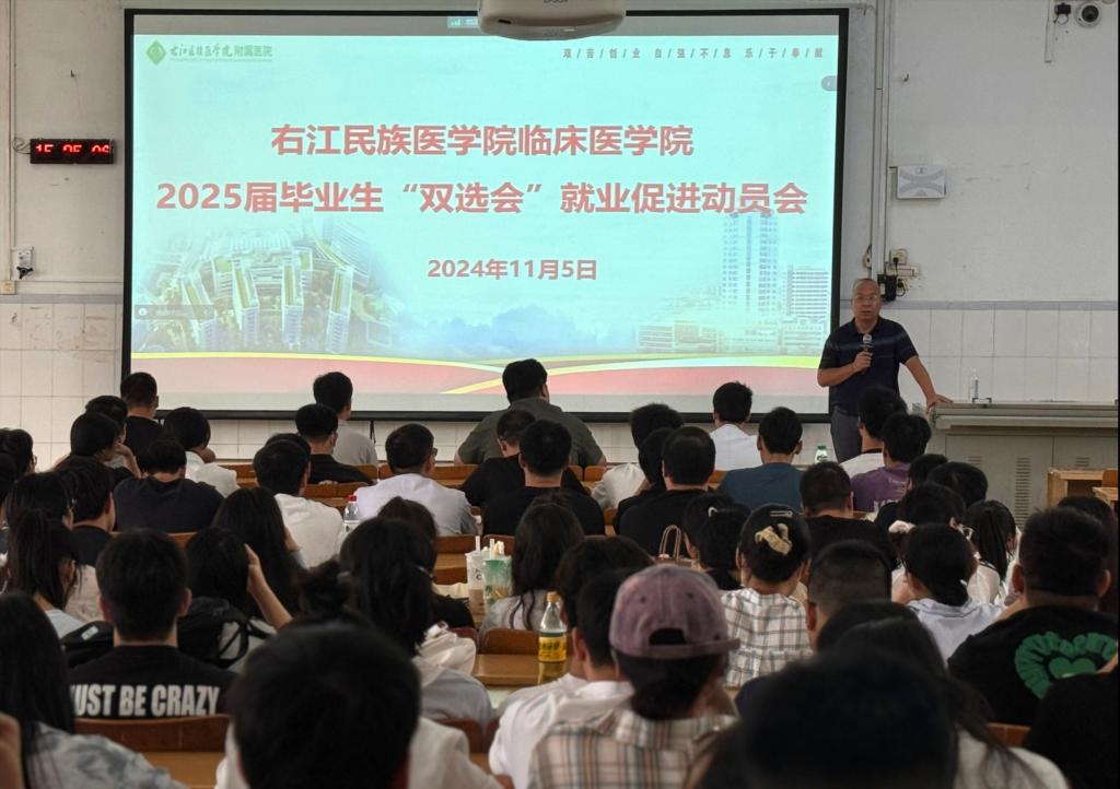 为做好临床医学院2025届毕业生就业工作,引导学生树立正确的就业观,调整就业心态,提高就业主动性、积极性,实现充分就业。11月5日,临床医学院召开2025届毕业生“双选”会就业促进动员会,学院党委陈文成副书记及毕业班辅导员黄勇老师主讲,2025届全体毕业生参会。