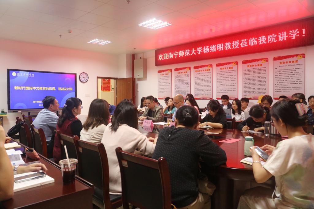 为提高鸭脖国际中文教师的教学能力与研究水平,不断增进与高水平院校的交流与合作,加强语言文化学院汉语教研室建设,11月6日下午,语言文化学院邀请南宁师范大学杨绪明教授作题为《新时代国际中文教育的机遇、挑战及对策》的学术讲座。讲座由学院副院长李培隆教授主持。国交中心张剑副主任、学院全体教师及对该主题感兴趣的老师参加讲座活动。