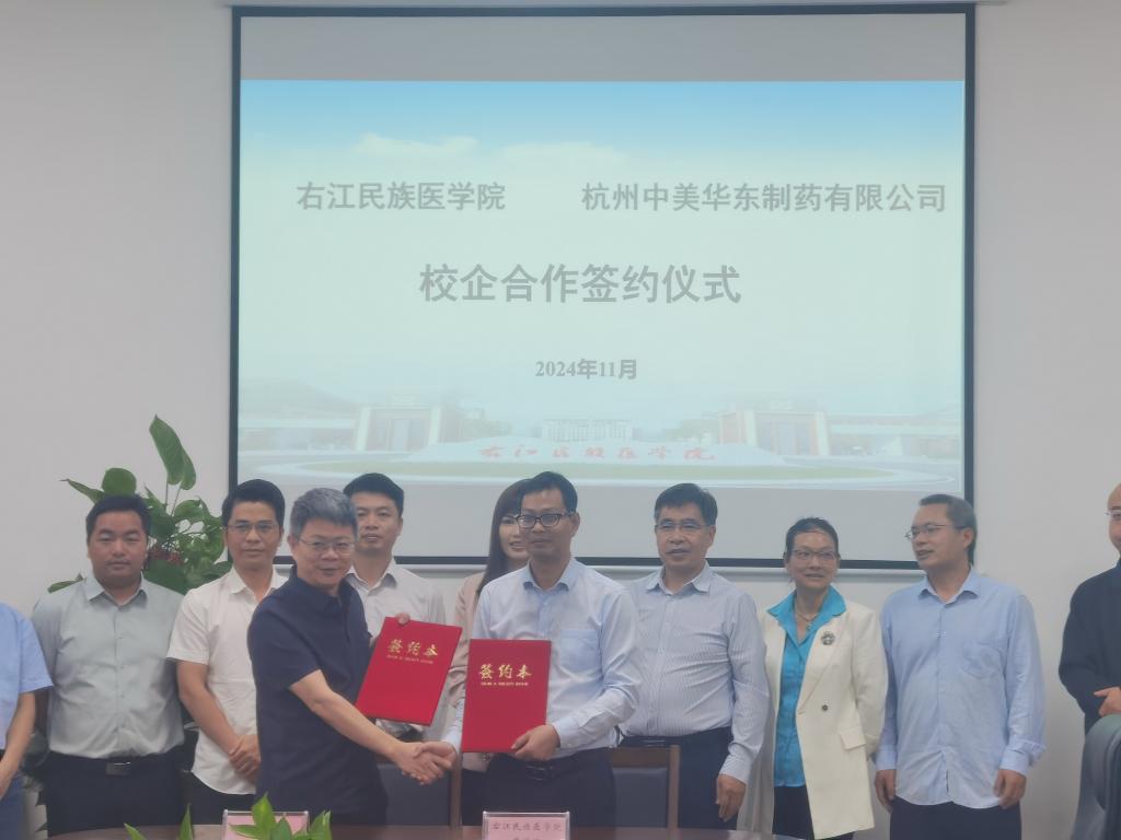杭州中美华东制药有限公司广西区总经理余捷对药学院的热情接待表示感谢,并介绍了中美华东的基本情况。他说,公司以“科研为基础,患者为中心”为经营理念,致力于服务大众健康,集中药、西药、生物技术、原料药产品及其制剂于一身,产品覆盖七大治疗领域,是医药行业的领军企业之一。随着医药行业的高速发展及国家对创新药的支持,企业希望能与高校开展“产学研”合作,通过深入参与校方人才培养和合作开展科研课题,双方实现双赢局面。双方就合作协议事项、条款、明细等进行了深入探讨,并签署合作共建协议书,标志着双方在教育与产业合作迈出了坚实的一步。
