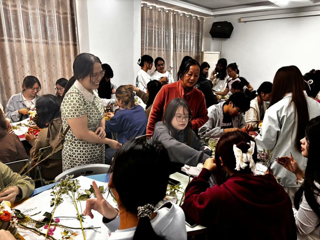 在插花体验课上,学院特邀的专业插花师罗老师为同学们授课。同学们以三人为一小组的形式,在罗老师的悉心指导下,认真进行插花创作。同学们在互相合作、讨论、实践的过程中不仅体验到了插花的乐趣,还感受到了插花艺术的魅力,在提升审美的同时也放松了心灵。学院党委副书记谭会恒老师与辅导员文希熙老师在现场与同学们一起参与活动,分享喜悦的心情。