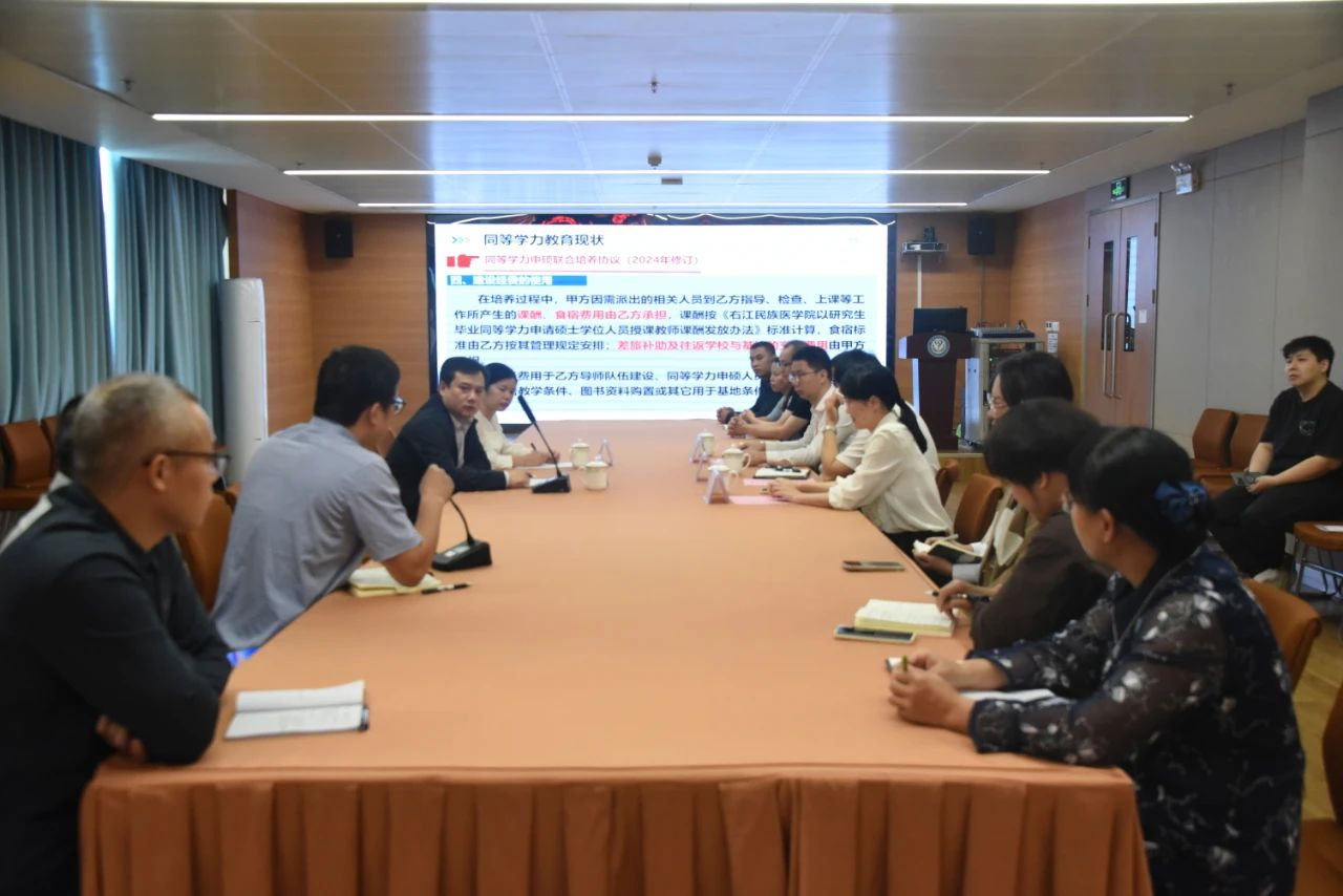 12日上午,莫小强一行到访梧州市人民医院开展交流座谈暨研究生联合培养基地检查,梧州市人民医院张春院长、科教科、人事科负责人及部分鸭脖研究生导师参加交流座谈会。梧州市人民医院对莫小强一行的到来表示热烈欢迎,并汇报了医院在教学、科研、研究生培养等方面的建设成效。莫小强介绍了鸭脖研究生教育发展现状,及同等学力教育工作的改革措施。会上双方热烈讨论了有关全日制研究生、同等学力申硕人员联合培养过程中的问题,研究生学院一一解答了导师们提出的问题。座谈会后莫小强一行参观了医院研究生宿舍、临床技能实训中心及实验室。