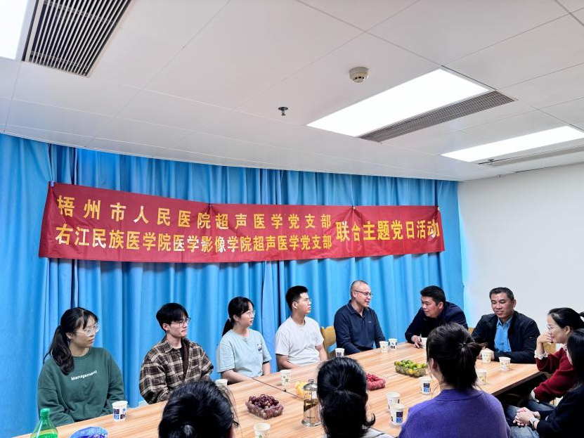 为了进一步激发基层党组织活力,增强党支部凝聚力和战斗力,推动广大党员履职尽责,11月22日下午,医学影像学院超声医学党支部在支部书记陈成彩带领下赴梧州市人民医院超声科开展联建联学活动,旨在加强两家医院超声医学科之间的合作交流,促进双方学科建设发展。