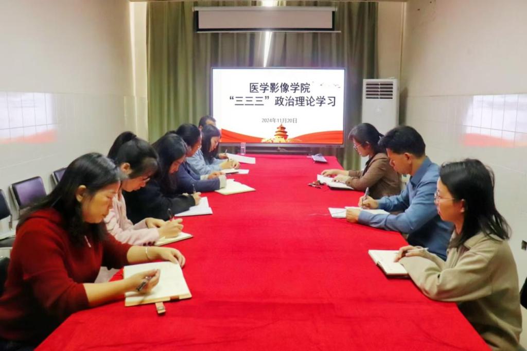 为深入学习贯彻党的二十届三中全会精神,落实学校人才培养方案,加强防诈骗宣传教育,11月20日下午,医学影像学院在百城校区6栋6楼党员活动室开展第十二周“三三三”政治理论学习。本次会议由学院党委书记李丹主持,学院本部全体教职工参会。