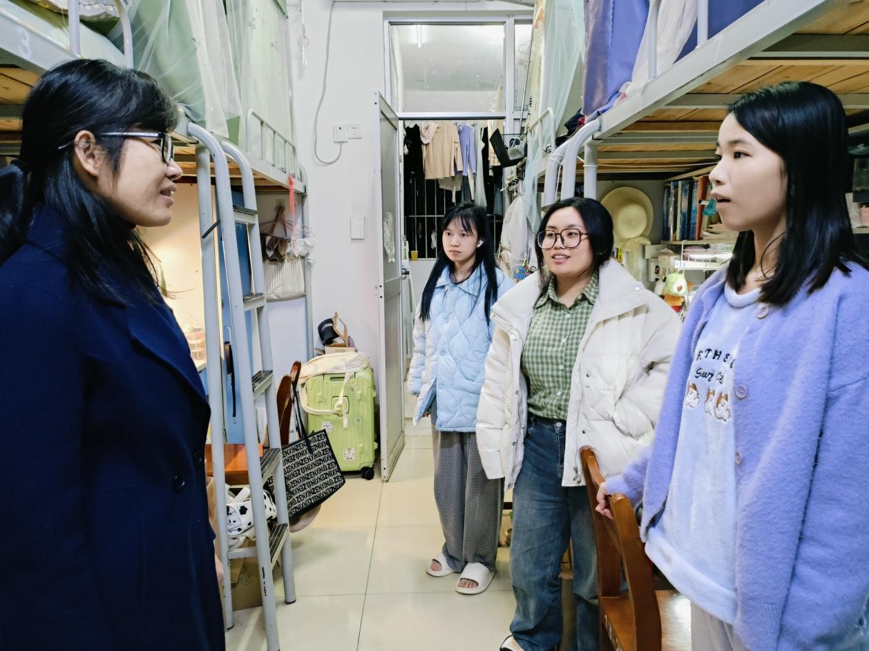 走访过程中,学院领导老师耐心倾听同学们的在校感受,对各年级同学的生活和学习进行关心和指导。学院党委书记李丹叮嘱同学们做好未来职业发展规划,在校期间认真学习,提醒同学们要注意安全问题,提高宿舍安全意识,遵守宿舍管理规定,保持宿舍环境卫生,营造良好舒适的宿舍环境。学院党委副书记黄春苗提醒大家积极认真备考,以饱满的状态迎接英语四六级考试和期末考试。
