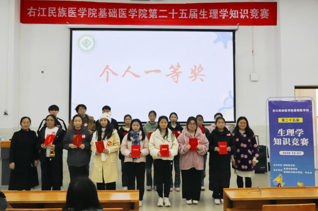 为点燃学生对生理学的探索热情,进一步夯实生理学知识体系,同时提升学生团队合作能力,基础医学院于2024年12月21日举办了第二十五届生理学知识竞赛,以营造一个积极向上、朝气蓬勃的学习氛围。来自2023级临床医学本科班1-12班、2023级临床医学本科(教改班)、2023级临床医学本科(农村订单班)1班、2023级口腔医学本科班、2023级医学影像本科1-4班各班一支参赛队伍,参加了本次竞赛。生理学教研室全体老师担任了本次竞赛的评委。