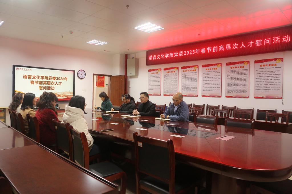 为深入贯彻实施人才强校战略,进一步做好联系服务高层次人才工作,表达对高层次人才的深切关怀,1月16日,语言文化学院党委开展2025年高层次人才座谈会暨春节前慰问活动。此次慰问对象为学院2024年晋升教授的黄国芳和晋升副教授的王秋媚、江利娟、赵梅鹃等四位老师,语言文化学院领导班子全体成员参加慰问活动。