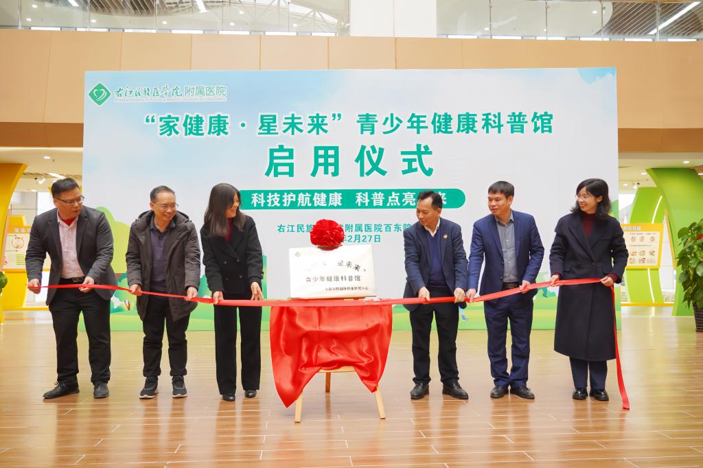 2月27日上午,临床医学院(附属医院)“家健康·星未来”青少年健康科普馆启用仪式在百东院区举行。医院党委书记黄照河,百色市科学技术协会副主席卢志荣,百色市卫生健康委员会四级调研员田燕珍,百色市教育局基教科科长、四级调研员龙光毅,共青团百色市委副书记韦芳,临床医学院(附属医院)副院长简崇东及百色市百东新区(百色高新区)社会事务局、百色市志愿者行动指导中心、广西大学附属中学百色分校团委等单位嘉宾,临床医学院(附属医院)护理科普小组医护人员、广西大学附属中学百色分校师生代表、患者和家属代表参加启用仪式和参观展馆。学院党委副书记陈文成主持启用仪式。