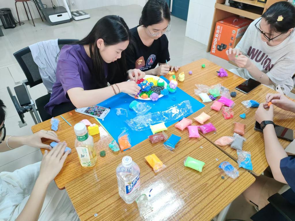 同学们结合“广西三月三”,使用超轻黏土DIY制作关于民族团结、家乡美食等创意作品。在制作中,同学们专注地将黏土轻轻按在桌面上,用指尖一点点按压、推拉,动作细腻而耐心。