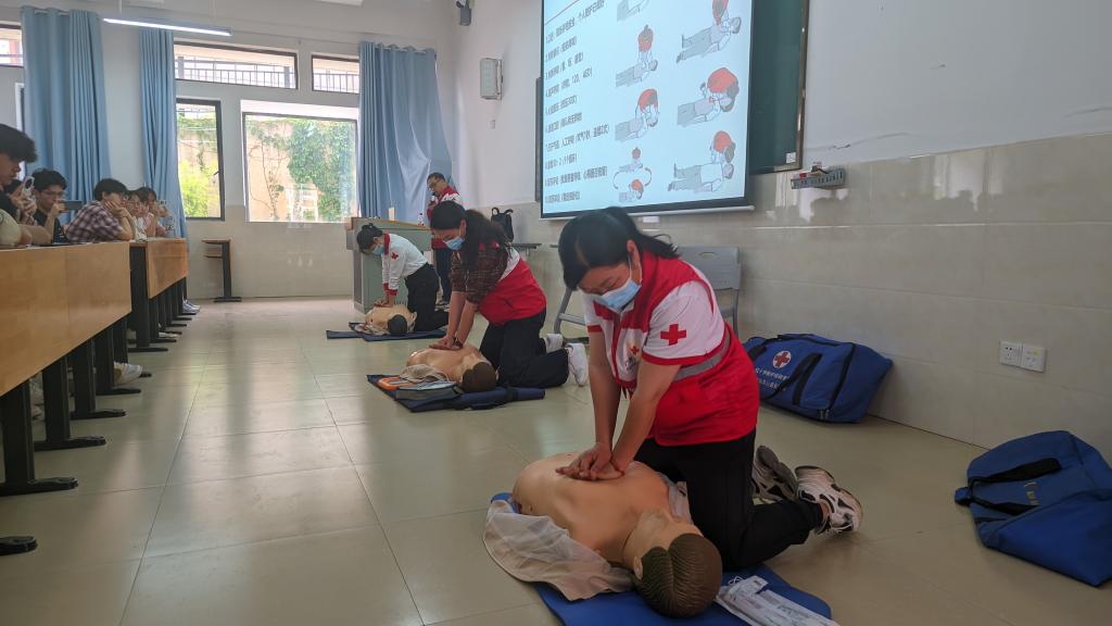 心肺复苏操作过程中,参训师生分组在模拟人教具上进行心肺复苏、人工呼吸及AED设备操作演练,红十字会的老师们俯身为学生演示,逐一指导动作要领,手把手纠正按压手势、调整按压节奏,确保每位学员掌握标准化急救技能。同学们围聚在老师周围,认真观察示范动作,并就心肺复苏操作过程中的疑问及时提问,与老师们形成了积极互动、教学相长的良好氛围。