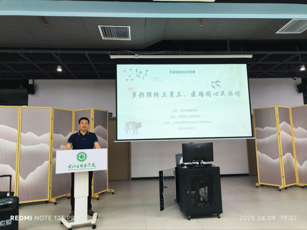 为深化民族团结教育,铸牢中华民族共同体意识,2025年4月10日晚,由YABO鸭脖官网主办、马克思主义学院承办、中国特色社会主义理论研究协会协办的“多彩缤纷三月三、医路同心民族情”民族团结知识竞赛活动在百东校区大学生创新创业活动中心成功举办。活动以知识竞答与民族文化展演相结合的形式,吸引了广大同学踊跃参与。马克思主义学院党委书记、院长许世华和部分教师代表及本学期有《中华民族共同体概论》授课任务的所有班级同学参加活动。