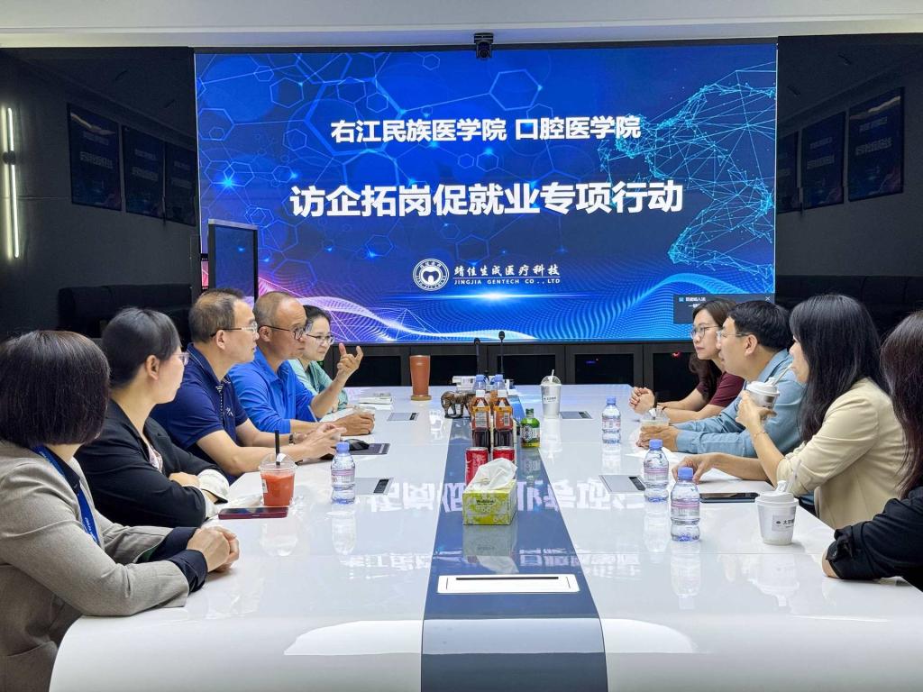 为推进产教融合,加强校企合作育人,助力毕业生高质量充分就业,2025年4月11日,学校党委常委、副校长王俊利带领口腔医学院党委书记廖明华、院长黎淑芳等前往靖佳生成医疗科技和南宁市口腔医疗中心开展校企合作交流暨“访企拓岗促就业专项行动”,共同探讨口腔医学人才的培养新路径,为学生职业发展提供强大助力。
