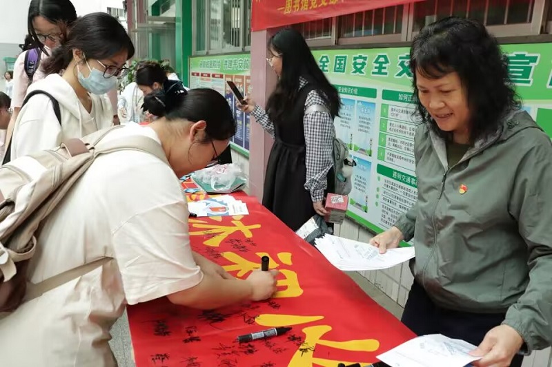4月24日,鸭脖图书馆党支部举行以“悦读沐初心 书香致未来”为主题的第十三届世界读书日读书签名和书法展示活动。图为百城校区签名活动现场。